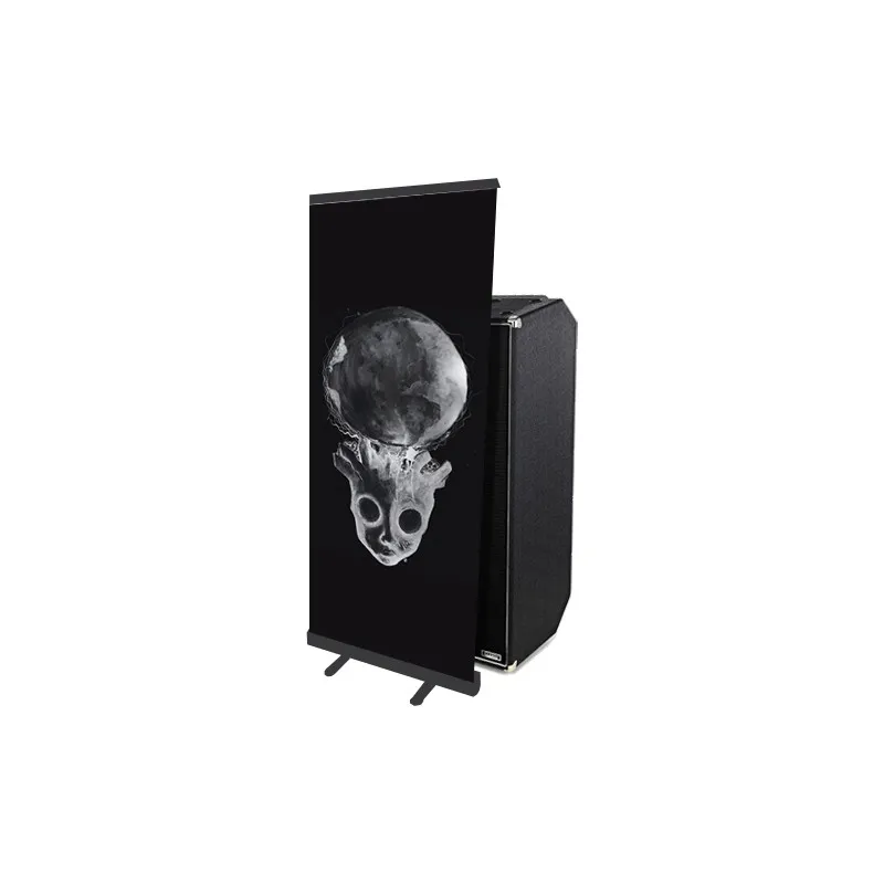 Retrouve ici tout le matériel de scène: peau de grosse caisse, backdrop...