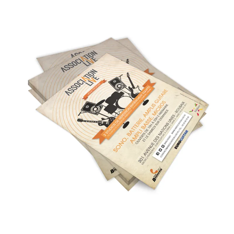 Grâce au flyer, tu peux faire connaître ton groupe et lancer la communication à propos d'un concert à venir, par exemple. Tu peux aussi t’en servir pour informer tes fans de la sortie de ton prochain album, et plus encore ! La musique ? On connaît car nous sommes membres de différents groupes. Du coup, nous saurons assurément répondre à tes besoins. Par exemple, on te conseille de choisir le flyer A5 250gr pour créer une fiche de présentation de ton groupe pour tes démarches de booking et de relation presse. Personnalise tes flyers en t’aidant de la matrice que nous mettons à ta disposition. En deux temps trois mouvements, tu auras un support de communication entièrement personnalisé !
